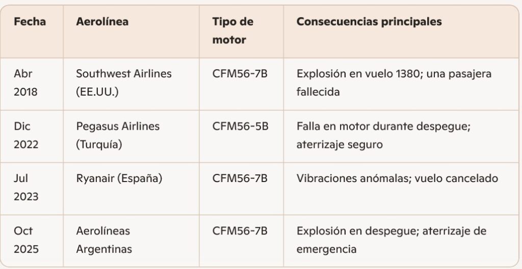 A continuación, una tabla con antecedentes relevantes de incidentes con motores CFM56 en distintas aerolíneas: